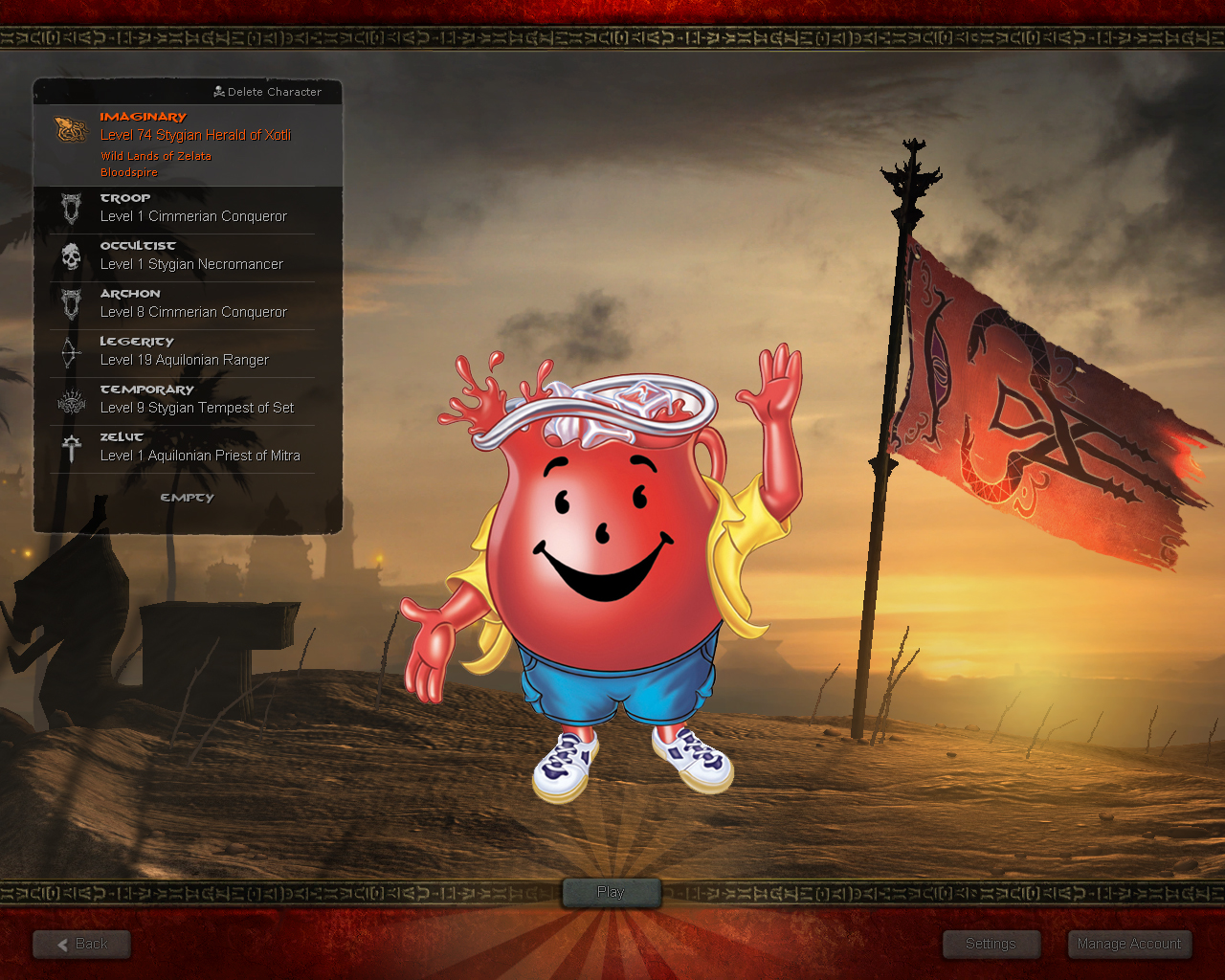 No, seriously, I logged on one day and the screen showed the backround without my character. I couldn't resist just photoshopping something in and putting it up. I had some fun. And laughs. I know he's not on the right angle so it looks a little funny, but this is just a quick joke anyways.